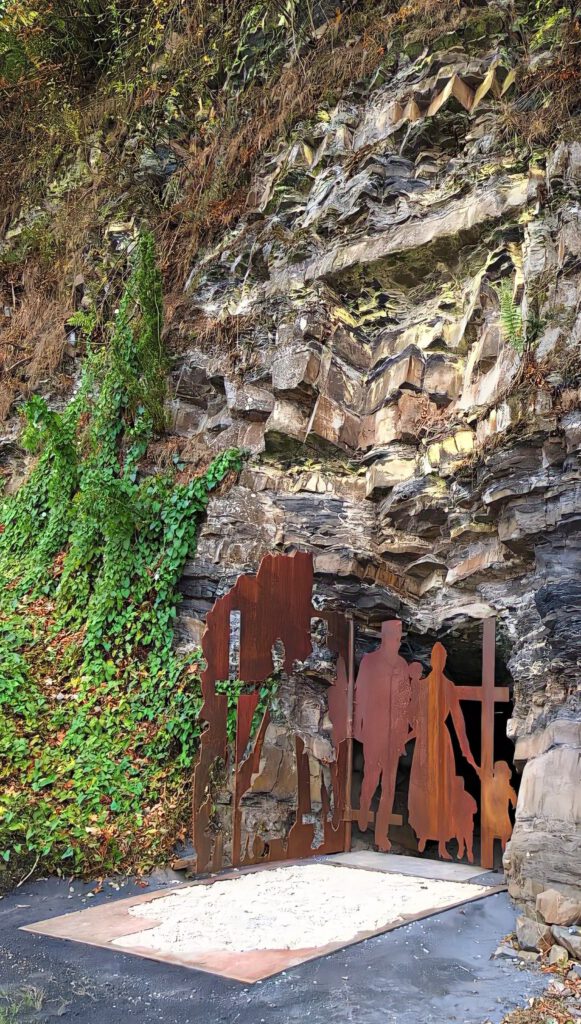Dazu wurde eine bildliche Szene als dreiteiliger Stahlschnitt gefertigt, welche eine typische Familie zeigt, die in kriegerischen Zeiten den Weg in die vermeintliche Sicherheit geht.